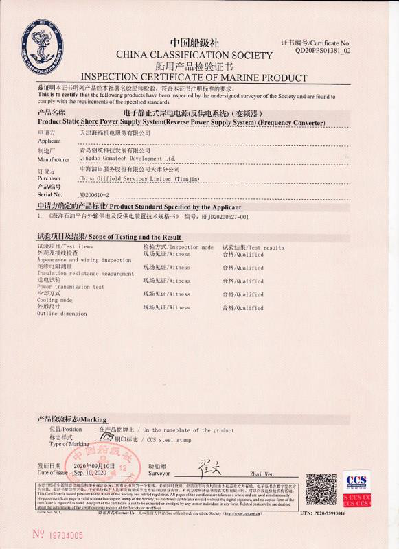 岸電設(shè)備通過了中國船級社認(rèn)證并獲得認(rèn)證證書,獲得國家電力電子產(chǎn)品質(zhì)量監(jiān)督檢驗(yàn)中心檢測證書。